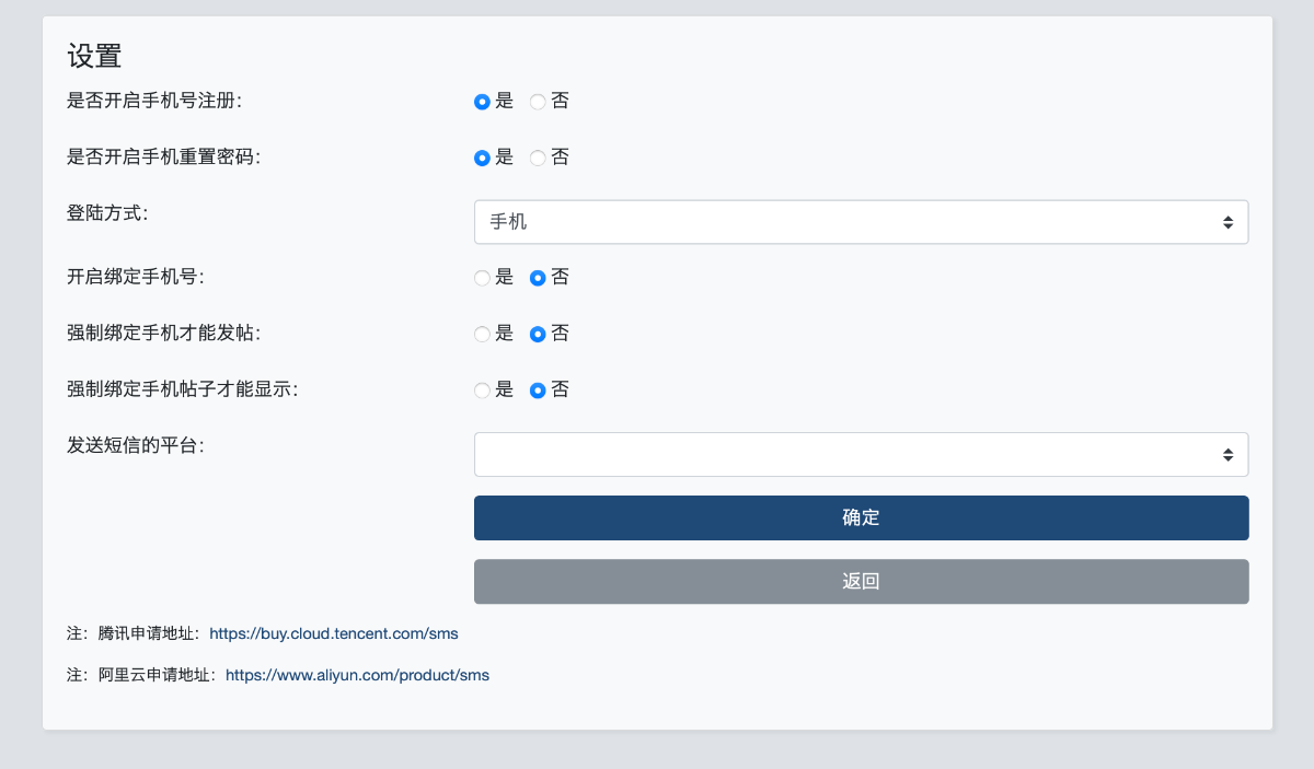 支持阿里云、腾讯云短信注册、绑定、找回密码等功能